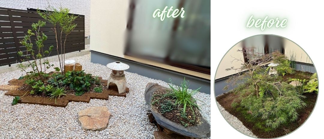 和の風情漂う灯篭を残しつつ、植栽との調和を図ったデザインに仕上げました。
