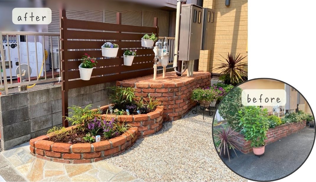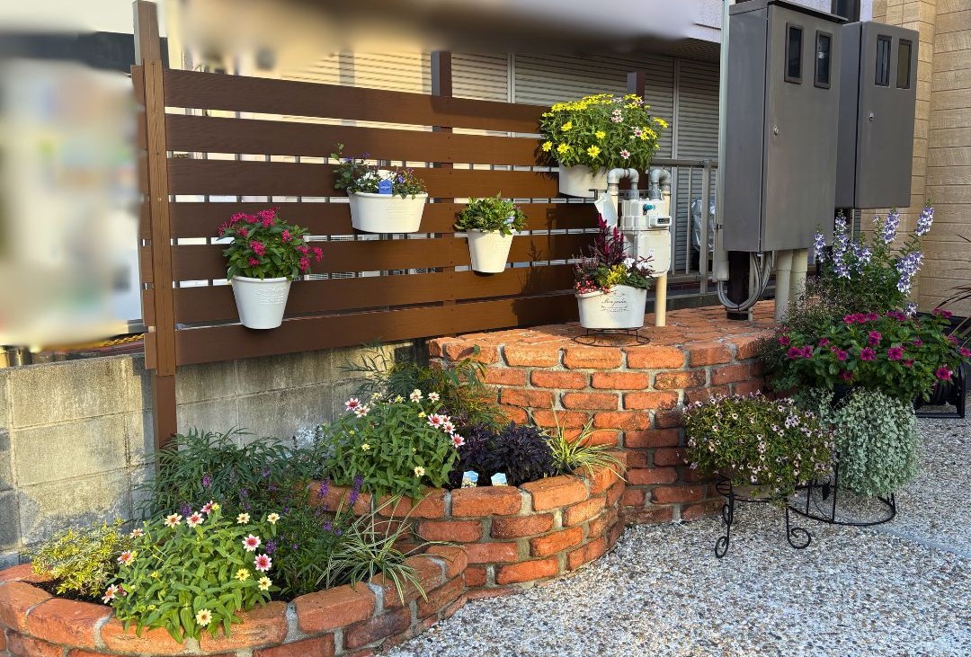 レンガ積み花壇とウッド調のフェンスを設けることで立体感と温もりをプラス。